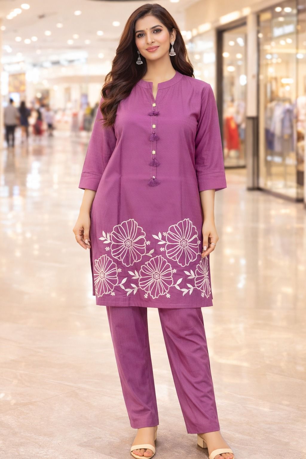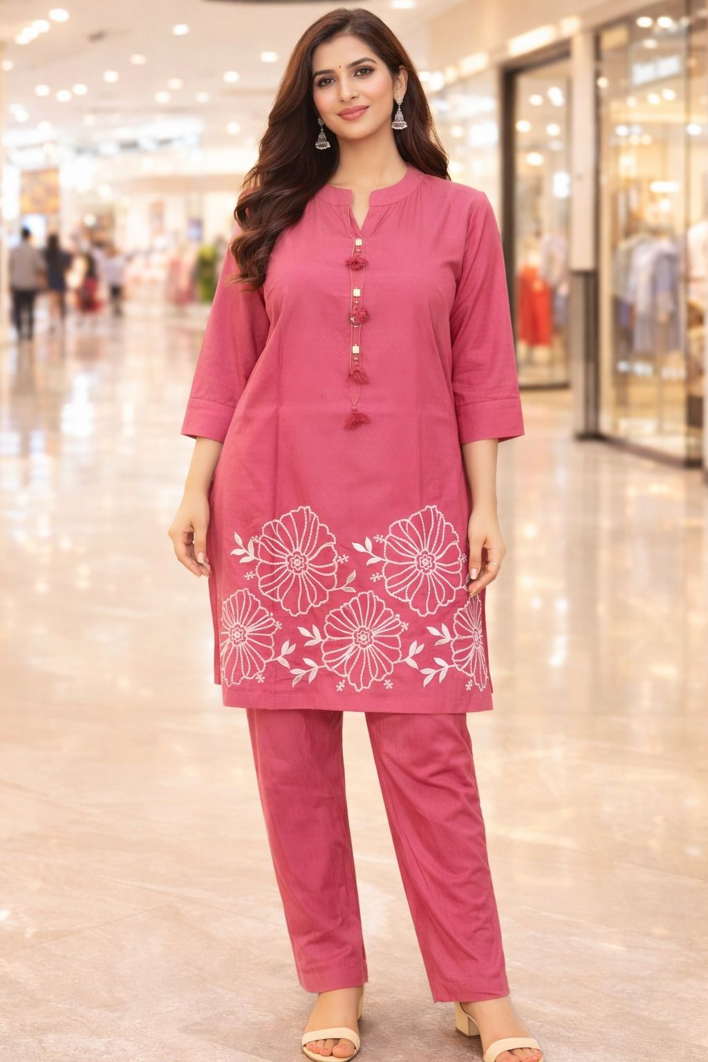 We offer a stylish Ladies Muslin Floral Embroidered Coord Set designed for casual occasions. This set includes a straight kurti top with 3/4 sleeves and matching straight pants, both made from high-quality muslin fabric. The regular fit ensures comfort while the floral embroidery adds a touch of elegance. Ideal for hand wash or mild machine wash care. Perfect for ladies who appreciate chic and comfortable coordinated outfits. As a Manufacturer, Exporter, and Supplier, we take pride in providing trendy and quality clothing options for women.